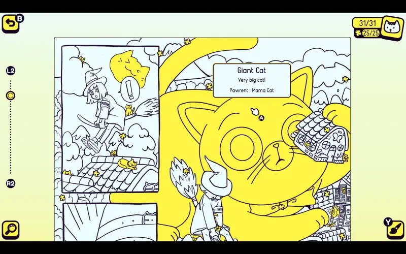Eine riesige Katze streift in ein friedliches Dorf und sorgt für unerwartetes Durcheinander. Eine junge Hexe muss eine sanfte Lösung finden, um Ruhe wiederherzustellen. In den wunderschön illustrierten, stummen Comic-Panels sind viele kleinere Katzen versteckt, die du entdecken kannst.