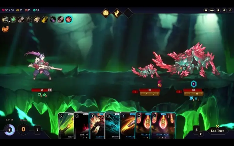• Anstatt sich gegenseitig direkten Schaden zuzufügen, wird der Kampf in Duellen ausgetragen, bei denen Angriff die beste Verteidigung ist, aber aufgrund begrenzter Ressourcen wird Mana nicht automatisch regeneriert. Inspiriert vom Land-System aus Magic: The Gathering werden die Kombos, die du ausführen kannst, davon bestimmt, wie viel Mana du verwalten kannst.