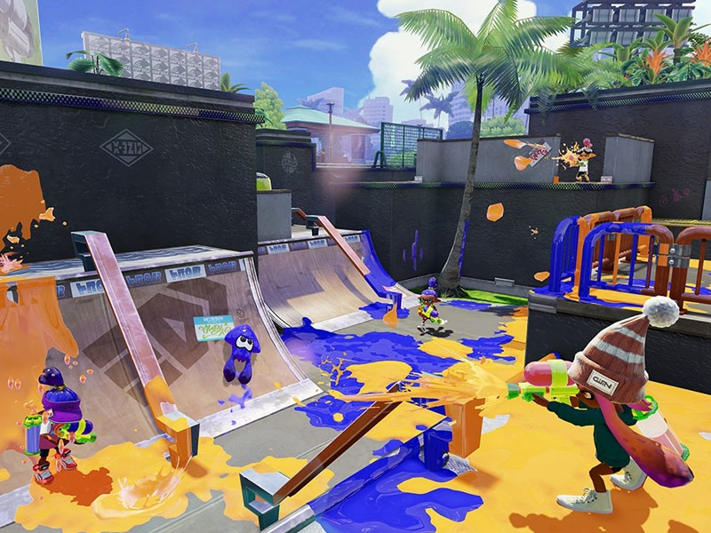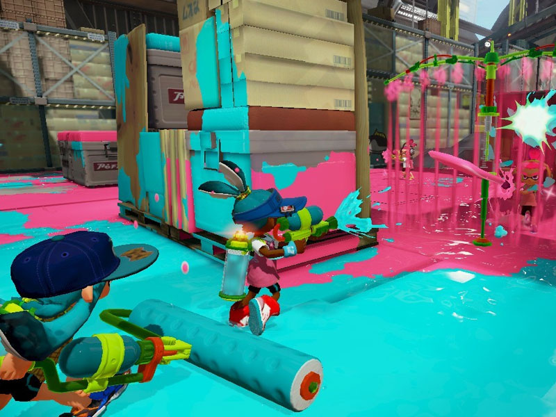 In Splatoon wirst du mit Farb-Trägerraketen ausgestattet, die dir unzählige Möglichkeiten bieten. Zum Beispiel kannst du den farbigen Teil der Rakete dazu verwenden, um dich in einen Tintenfisch zu transformieren und wie dieser zu schwimmen, quasi unsichtbar werdend …
