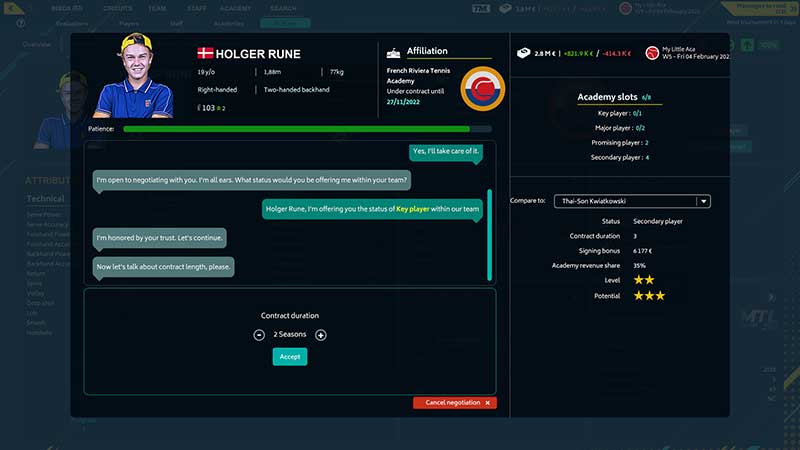 Werde im Tennis Manager 2022 zum Tennistrainer oder zum Leiter einer Tennisakademie. Trainiere deinen zukünftigen Tennisstar mit neuen und realistischen Funktionen.